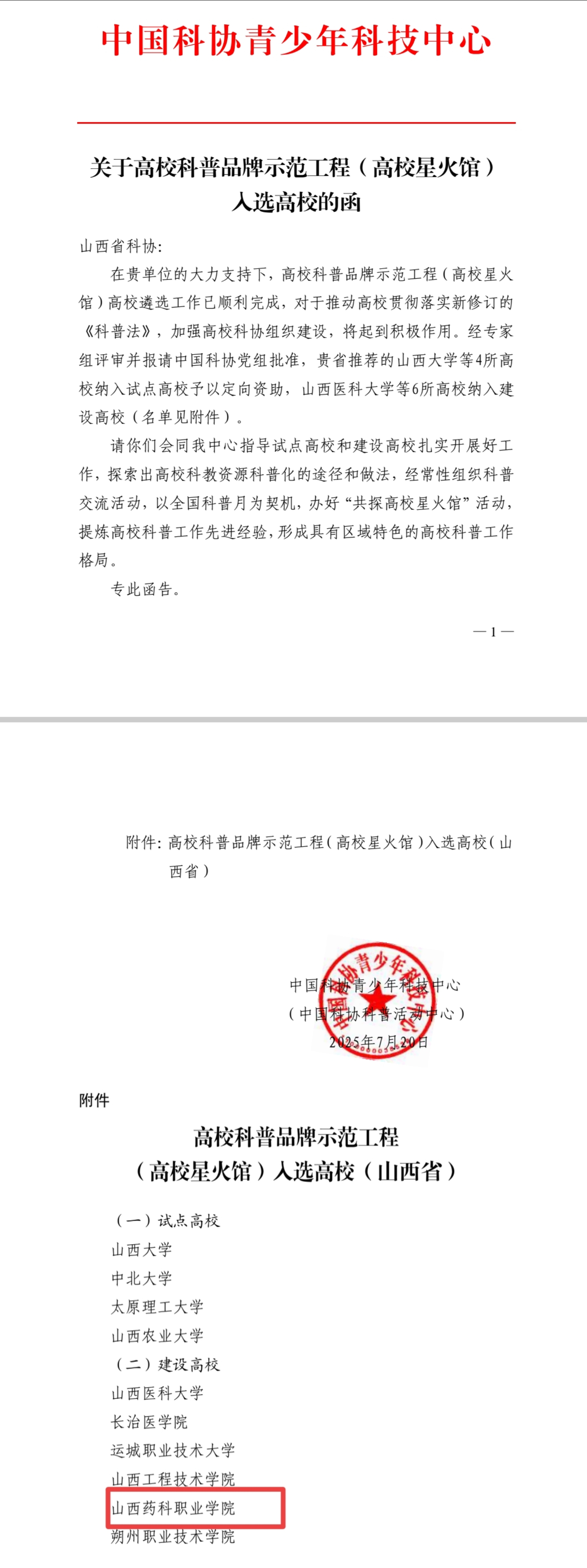 近日,中国科协青少年科技中心正式公布2025年度“高校科普品牌示范工程(高校星火馆)”入选名单,山西药科职业学院成功入选建设高校行列。
