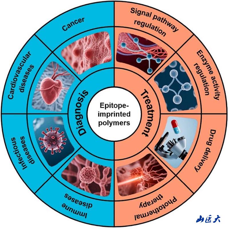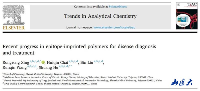 8月24日,山西医科大学药学院胡爽教授团队在国际分析化学期刊 Trends in Analytical Chemistry(中国科学院一区TOP期刊,IF=12)发表综述论文“Recent progress in epitope-imprinted polymers for disease diagnosis and treatment”,药学院药物分析教研室青年教师邢荣荣为第一作者,邢荣荣副教授和胡爽教授为共同通讯作者。