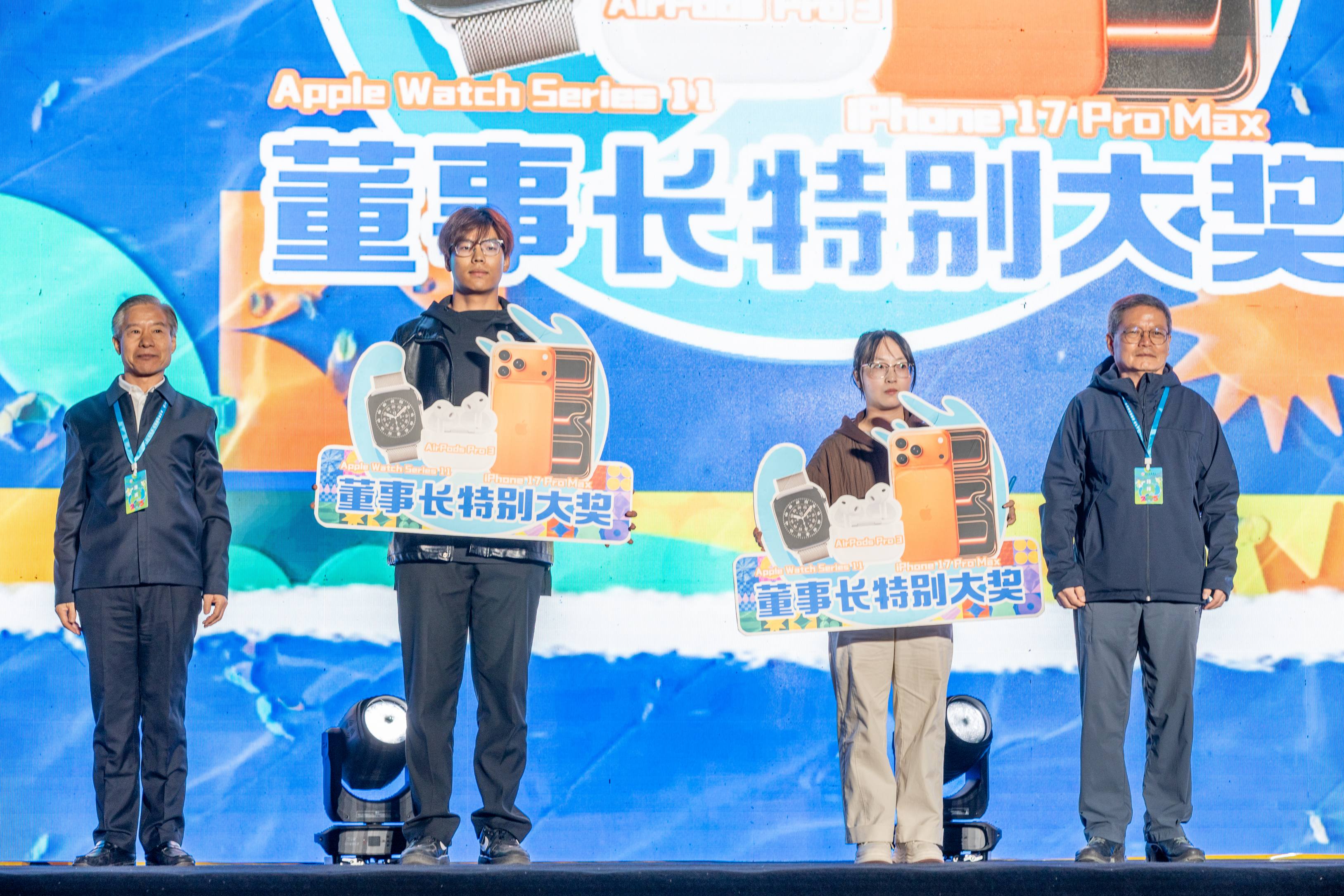在热烈的氛围中,与会嘉宾现场抽取了9名“董事长特别奖”和2名“董事长特别大奖”,学校分别为幸运师生送出iPad Air及包含iPhone 17 Pro Max、Apple Watch Series 11、AirPods Pro 3三件套的豪华Apple大礼包。