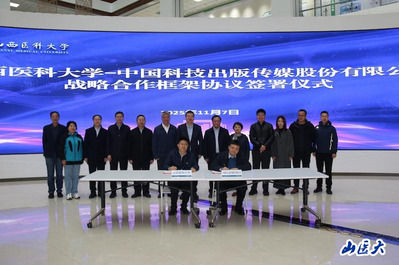 11月7日,山西医科大学与中国科技出版传媒股份有限公司战略合作框架协议签约仪式在中都校区科技楼举行。山西医科大学校长解军、副校长张岩波,中国科技出版传媒股份有限公司党委书记、董事长、总经理胡华强,副总经理陈亮等出席签约仪式,双方相关部门负责人等参加了签约仪式。