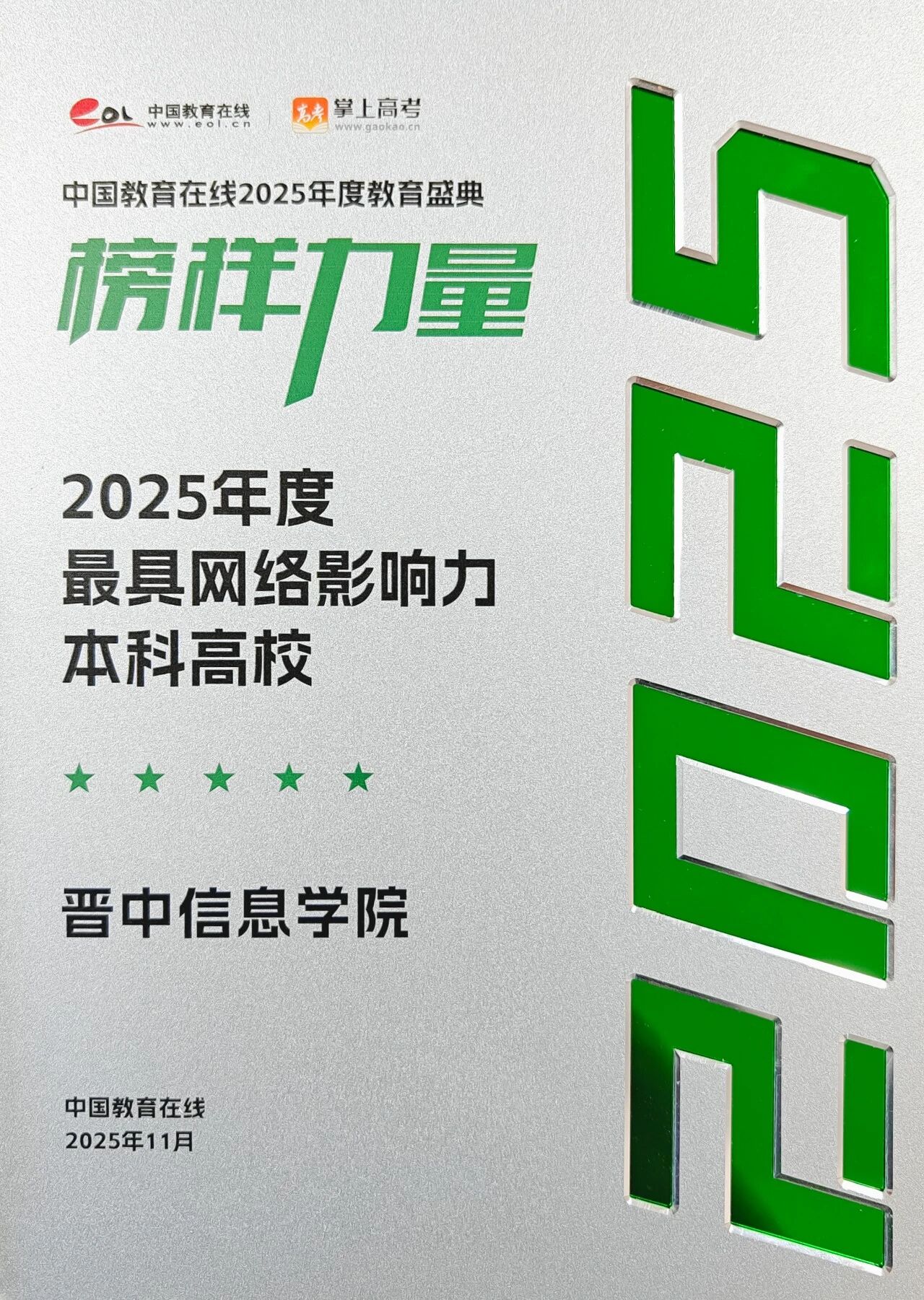 近日,中国教育在线“榜样的力量·2025年度教育盛典”优秀案例名单正式公布。晋中信息学院凭借其在招生宣传方面的前瞻布局,以及在新媒体领域的创新实践与显著成效,获评“2025年度最具网络影响力本科高校”。