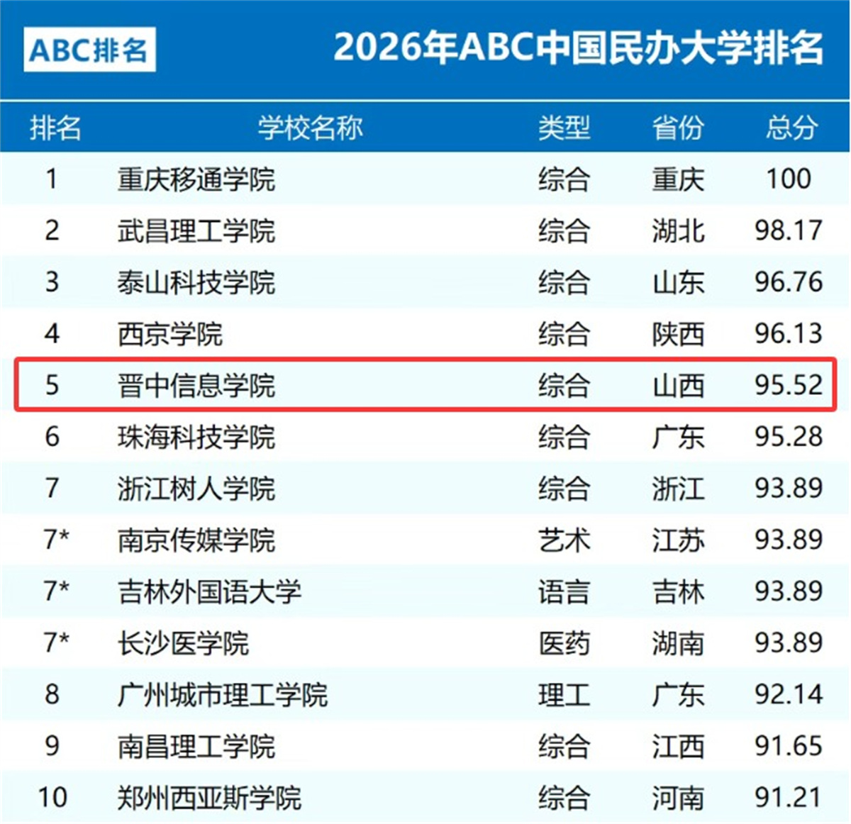 近日,ABC排名发布2026年中国民办大学排名,晋中信息学院凭借卓越的办学实力、鲜明的育人特色与持续提升的社会声誉,位列全国第五,且连续三年稳居山西省同类院校首位(2024-2026年)。