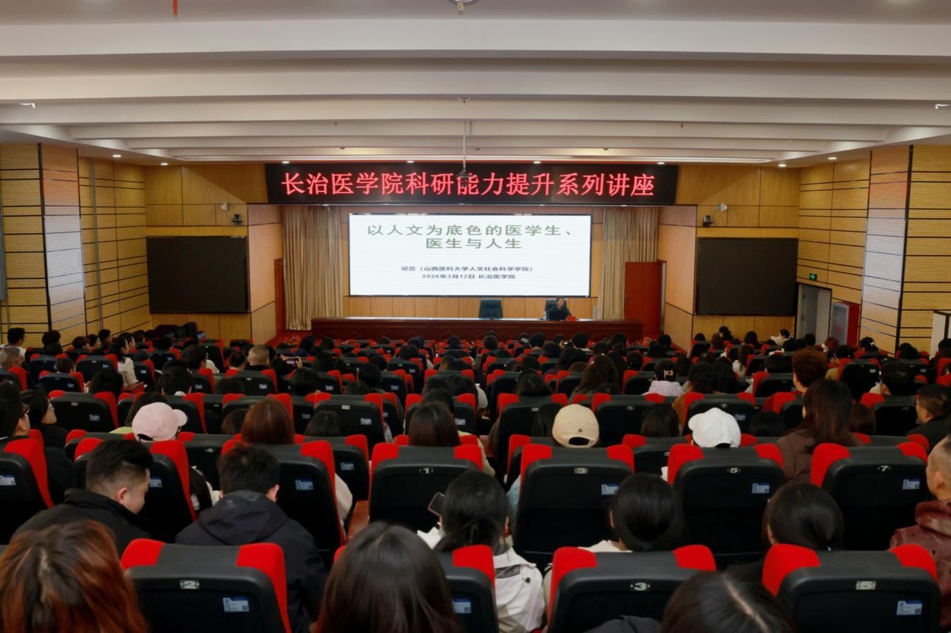 在长治医学院建校80周年之际,3月12日,山西医科大学人文社会科学学院院长邓蕊教授应邀到访长治医学院,在长治医学院济世厅为师生及附属医院医务工作者作题为《以人文为底色的医学生、医生与人生》的专题讲座,深入探讨人文精神在当代医学教育与实践中的核心价值。讲座由长治医学院科学技术部部长曹文君主持。