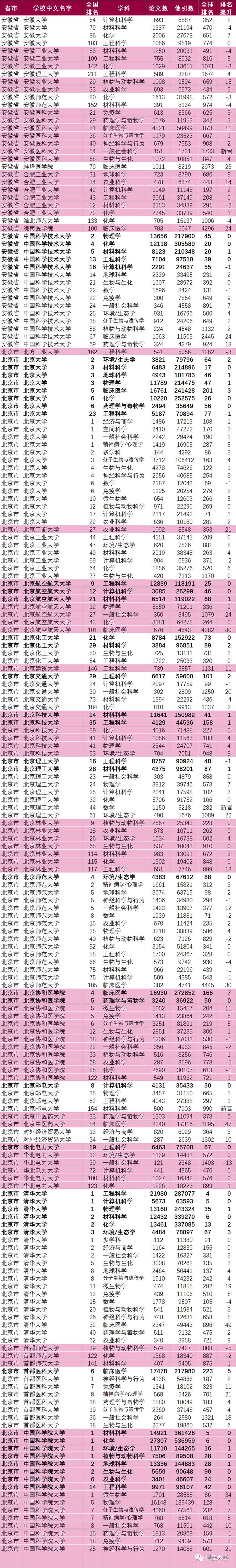 全国各高校ESI上榜学科情况