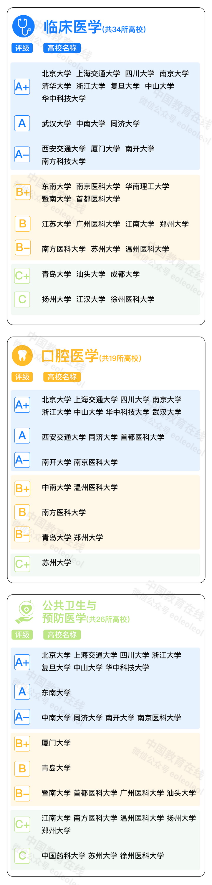 中国大陆11所高校在至少一门医学学科中获得A+评级。北京大学、上海交通大学和四川大学在该支柱领域所有7门学科中都获得A+。