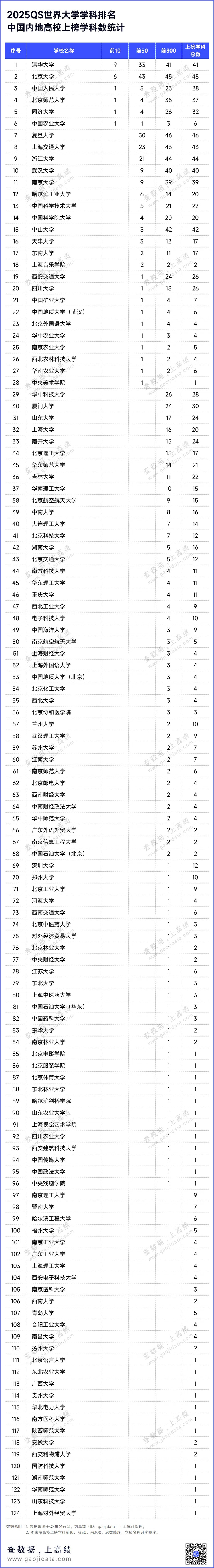具体中国内地高校上榜学科数统计如下: