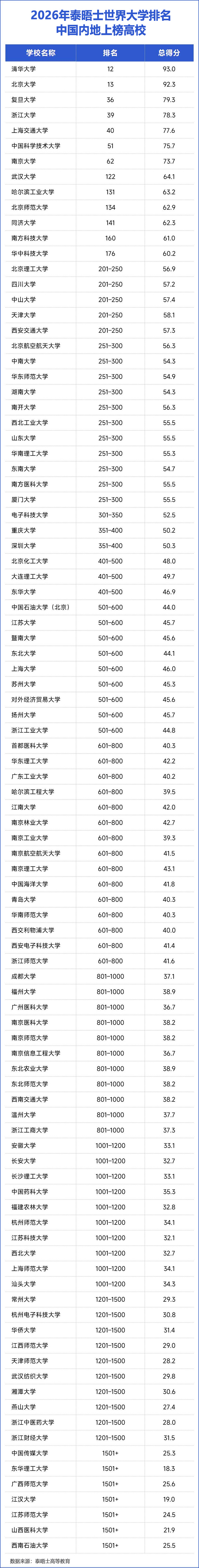2026泰晤士世界大学排名发布,中国大陆97所高校上榜