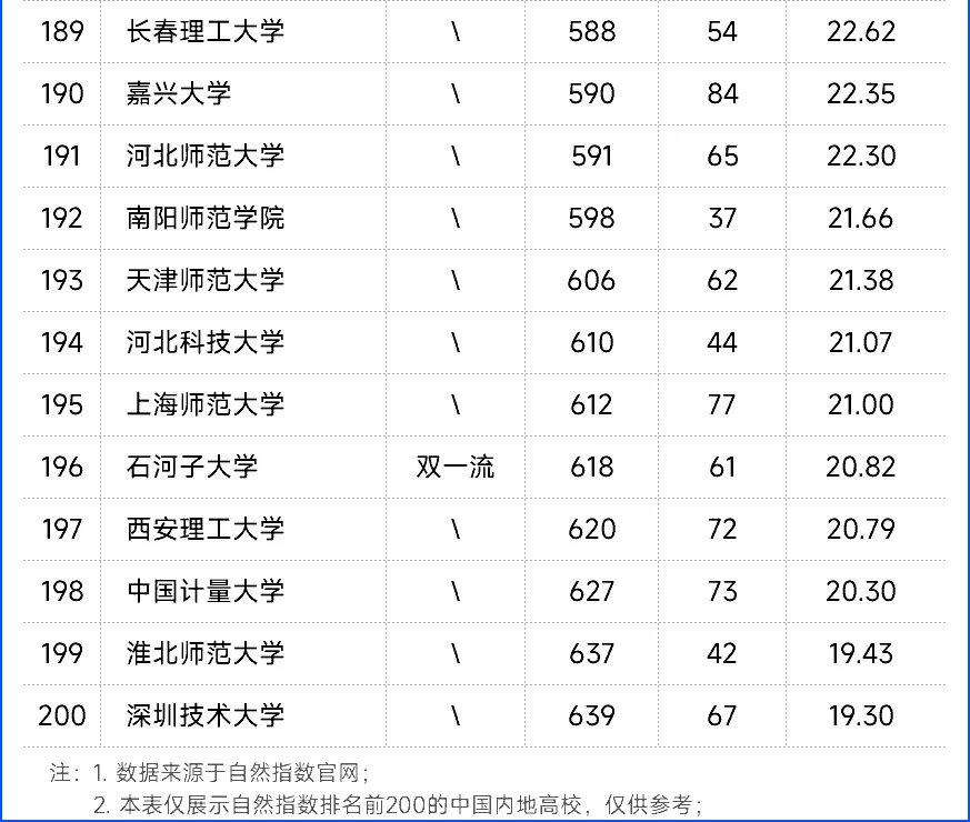 最新自然指数排名中国内地高校Top200名单(统计时间节点为2024.8.1-2025.7.31)