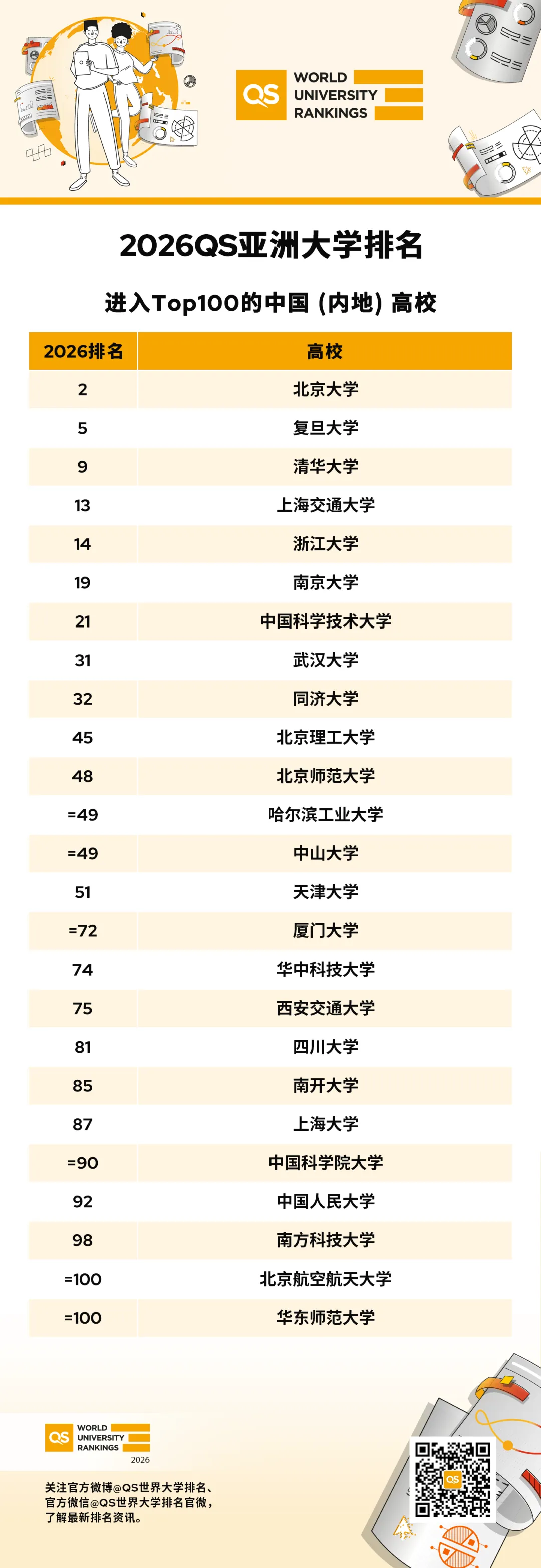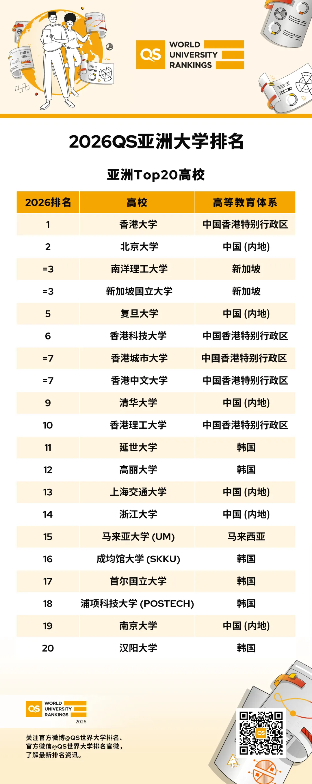 国际高等教育研究机构QS Quacquarelli Symonds于11月4日正式发布了2026QS亚洲大学排名。
