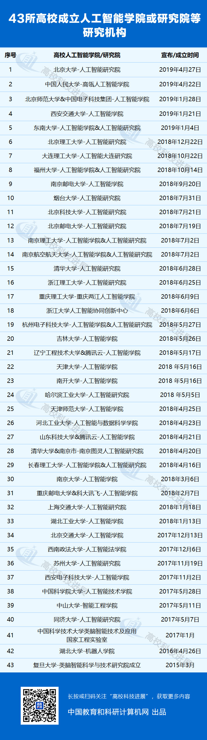 中国教育和科研计算机网梳理并汇总了近年来高校宣布成立人工智能学院或研究院等研究机构的情况。