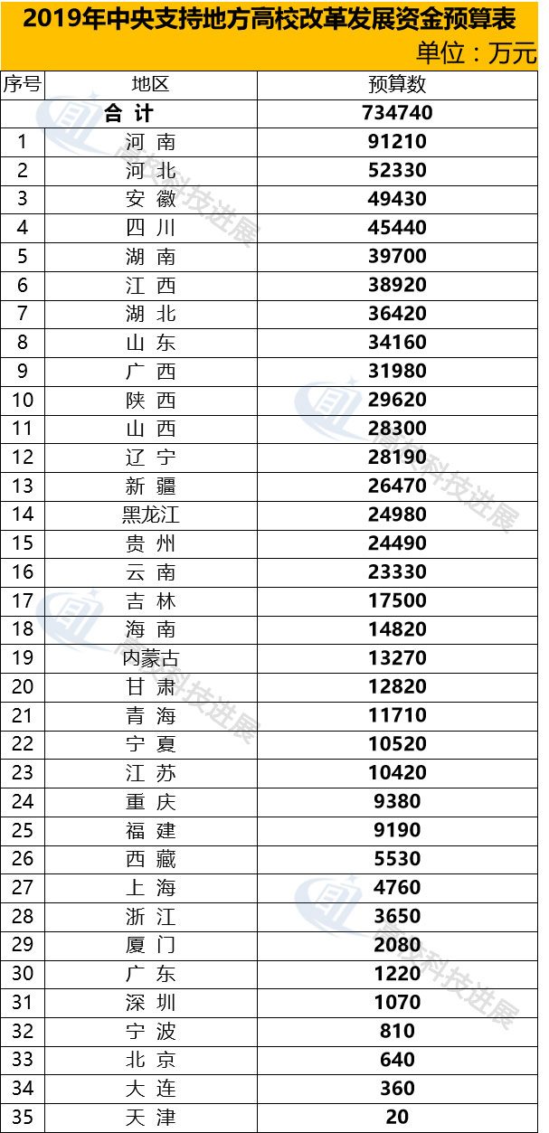 根据2019年中央支持地方高校改革发展资金预算表显示,这项国家专项资金将下拨给全国35个省、直辖市、自治区和计划单列市的地方高校,总经费累计为73.47亿元。