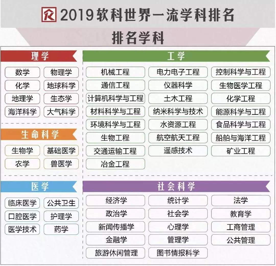 软科26日正式发布2019“软科世界一流学科排名”(ShanghaiRanking‘s Global Ranking of Academic Subjects)。2019年排名覆盖54个学科,涉及理学、工学、生命科学、医学和社会科学五大领域。