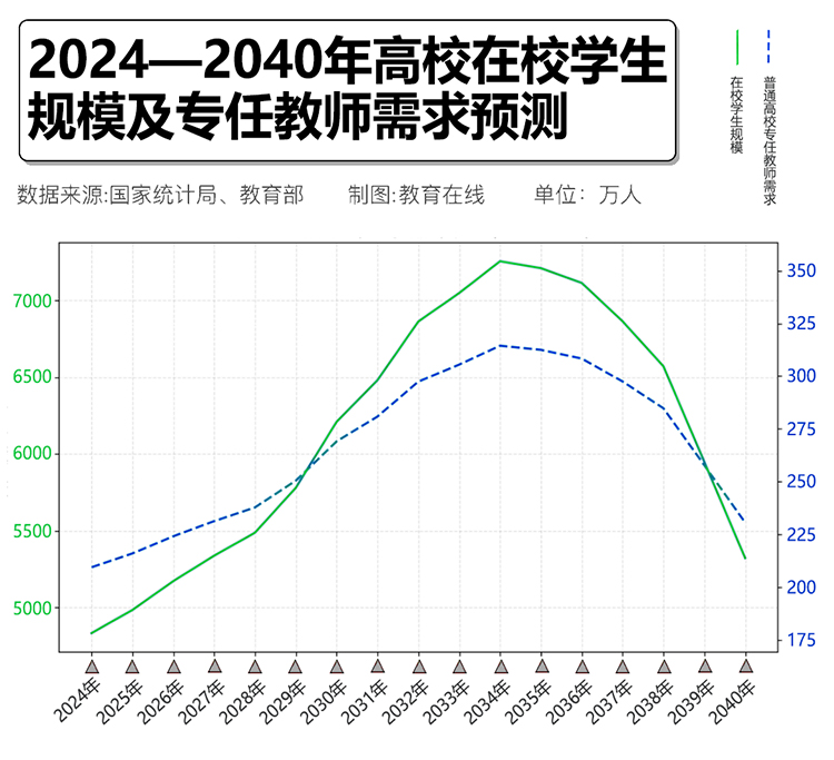 结果显示,2034年普通高校专任教师需求将达到314万人。相比2023年的206万人,未来十年理论上需要新增约108万教师。