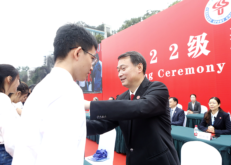 典礼上,党委书记、博士生导师舒为平教授及全体校领导们为2022级新生代表佩戴了校徽,在广大教职工、家长们的见证下,全体新生共同佩戴校徽,正式加入了成体大家庭。