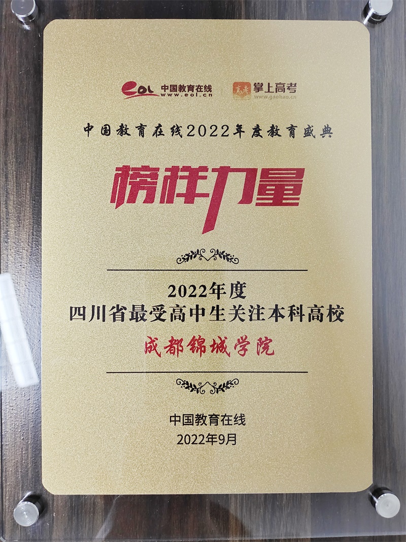 近日,中国教育在线“榜样力量·2022年度教育盛典”评选获奖名单揭晓,成都锦城学院荣获“2022年四川省最受高中生关注本科高校”荣誉称号。