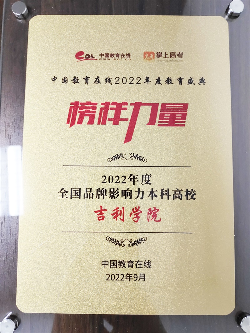 近日,中国教育在线“榜样力量·2022年度教育盛典”评选获奖名单揭晓,吉利学院荣获“2022年度全国品牌影响力本科高校”。
