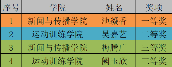 经过激烈角逐,新闻与传播学院的池凝香和运动训练学院吴嘉艺同学从比赛中脱颖而出,分别获得演讲比赛的一等奖、二等奖。