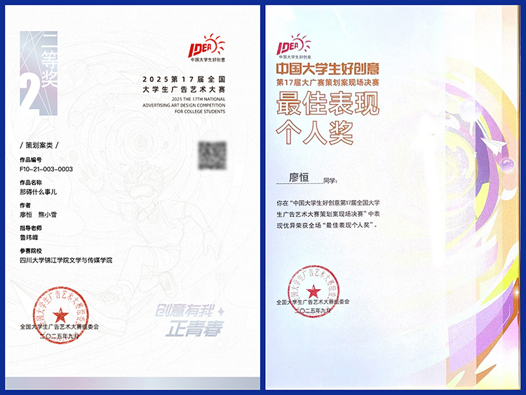 作品《那碍什么事儿》以牙膏品牌为命题,以“从‘齿’开始,微笑Nice”为核心创意理念,聚焦社群、运动与娱乐三大年轻人高频生活场景,通过沉浸式营销策略实现品牌与用户的深度互动,有效传递产品核心卖点,助力品牌实现认知深化与市场增长,得到现场评委一致认可,获得全国二等奖。值得一提的是,在强手如云的角逐中,四川大学锦江学院廖恒同学表现突出,荣获“最佳表现个人奖”。该奖项为大广赛策划案现场决赛特设,旨在表彰综合素质优异的参赛者,不仅体现出竞赛的专业性与高水平,也凸显了其作为激发创意、锻炼实践能力和促进交流的平台价值。