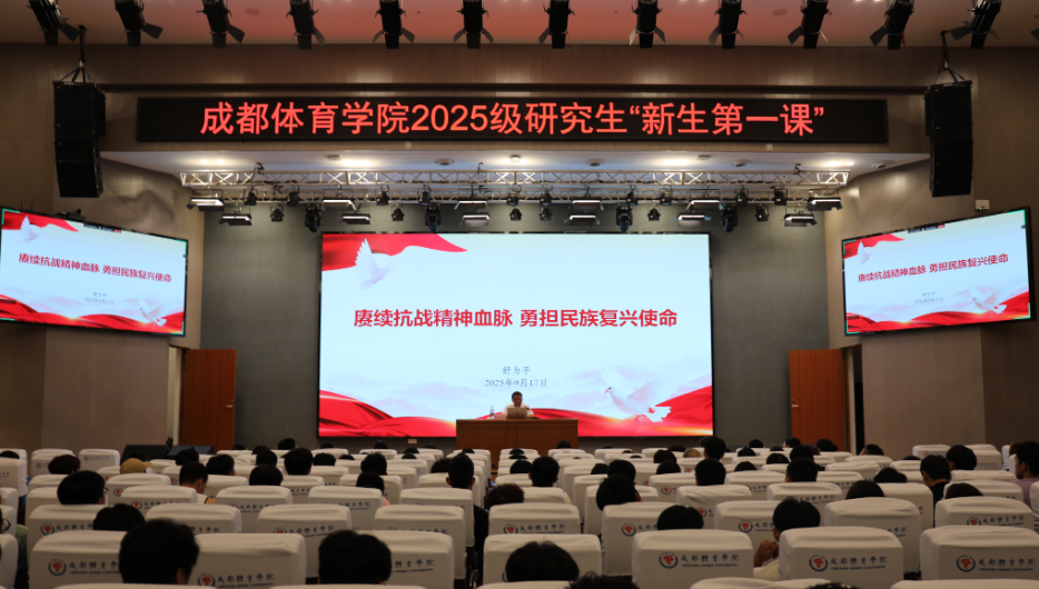9月17日晚,成都体育学院党委书记舒为平教授以“赓续抗战精神血脉,勇担民族复兴使命”为题,为2025级研究生讲授“新生第一课”。600余名硕士、博士研究生,各学院及研究生管理办公室、学生处、研究生院等相关负责人参加了本次活动。