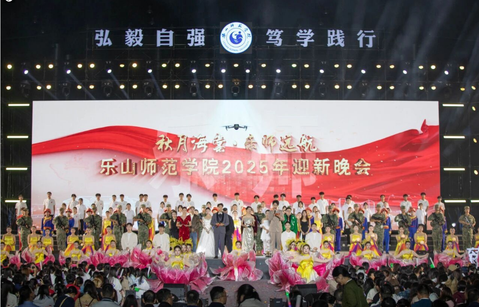 此次迎新晚会不仅为同学们提供了一个展示自我、融入集体的重要平台,也为他们即将开启的大学征程注入了澎湃动力与美好期许。晚会由师生倾力打造,参演的主要演员都是新生,还有来自各地的校友代表、历时半个月的精心筹备与反复打磨,节目主题鲜明、形式多样,既洋溢着青春的活力与风采,也深刻诠释了学校“以文化人、以美育人、立德树人”的育人理念。相信在乐山师范学院这片人文底蕴深厚的沃土上,新一届乐师人必将承载着师长的殷切期望,不负韶华、砥砺前行,以奋斗之笔书写无愧于时代的青春华章。