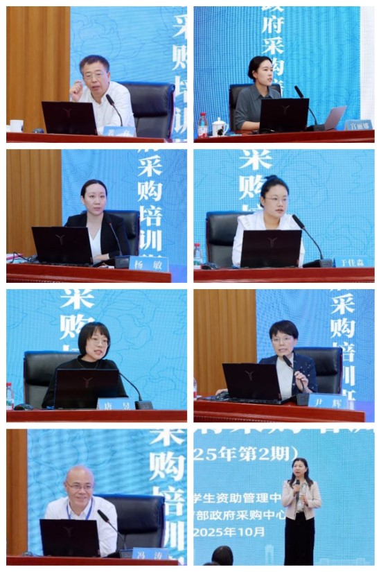 南京审计大学教授裴育、财政部国库司宫丽娜、中国人民大学杨敏和教育部政府采购中心于佳淼分别作“审计监督视角下的政府采购风险管理”“政府采购争议处理及典型案例分析”“采购人主体责任解析”“教育部政府采购审核审批业务详解”专题报告;教育部政府采购中心唐昱、中南大学尹辉、西南交通大学冯涛分别针对服务、货物和工程三类项目开设采购文件编制组课。