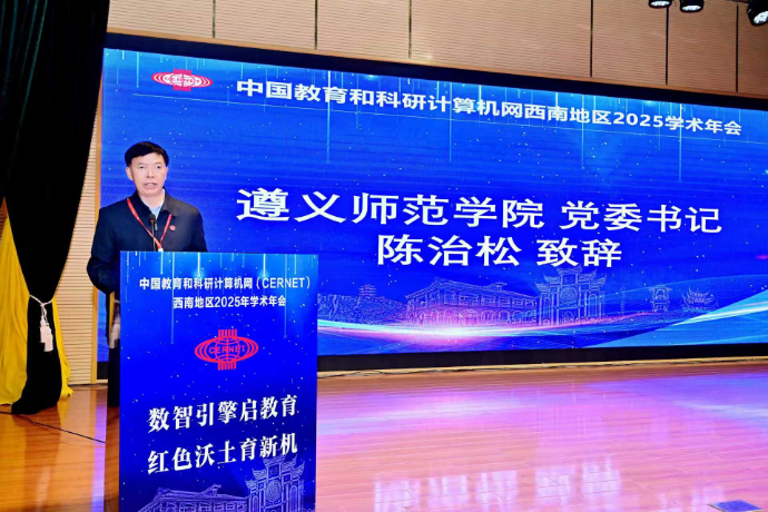 陈治松代表承办单位致欢迎辞,向与会嘉宾表示热烈欢迎,并介绍了遵义师范学院在网络与信息化建设方面的实践成果。他指出,学校近年来持续完善网络基础设施,推进系统整合与数据治理,初步构建了以数据驱动为核心的智慧校园生态。承办此次年会既是对学校信息化工作的认可,也为区域交流提供了宝贵平台。
