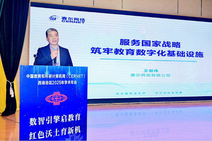 赛尔网络公司王祖伟副总经理做题为《服务国家战略,筑牢教育数字化基础设施》的报告。他回顾了CERNET三十年来服务国家战略、支撑教育现代化的历程,强调未来将继续通过科技与产业融合,致力于筑牢我国教育数字化的网络与安全基石,为教育强国建设提供坚实支撑。