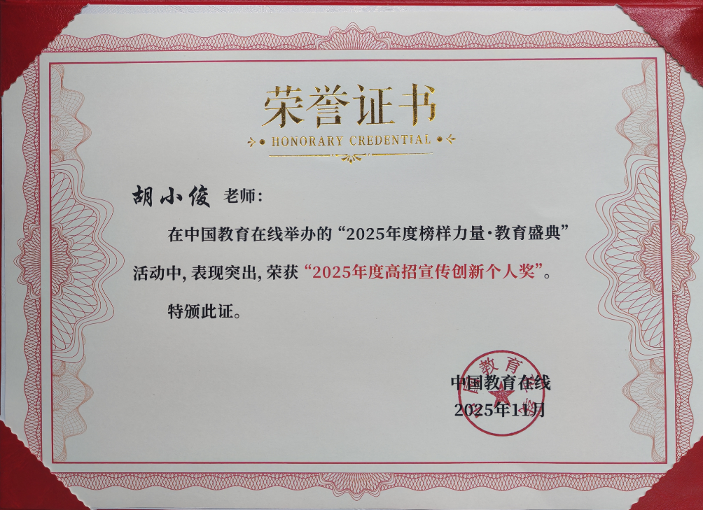 这一殊荣不仅体现了胡小俊老师在高招宣传工作中的突出贡献,更反映出学校在招生宣传创新领域的战略布局与显著成果。通过系统总结其成功经验,将有效引导广大教育工作者积极探索创新实践路径,从而为学校招生工作持续注入发展动能。