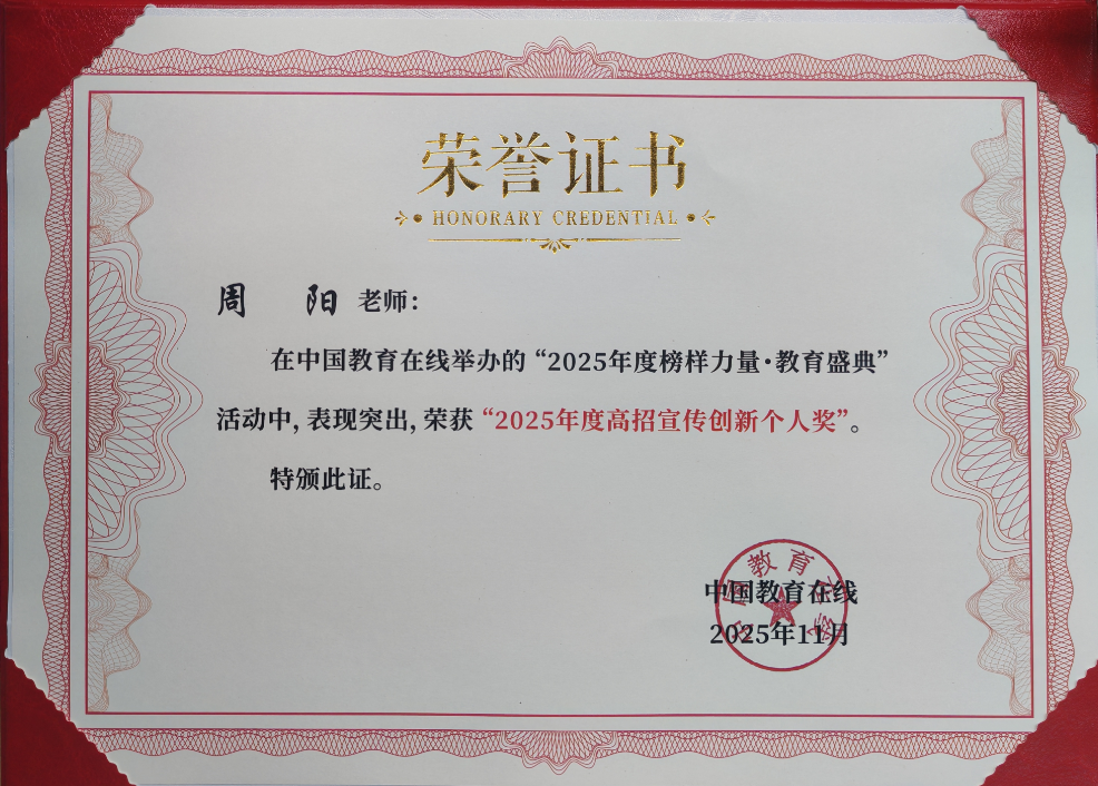 这一殊荣不仅体现了周阳老师在高招宣传工作中的突出贡献,更反映出学校在招生宣传创新领域的战略布局与显著成果。通过系统总结其成功经验,将有效引导广大教育工作者积极探索创新实践路径,从而为学校招生工作持续注入发展动能。