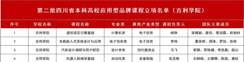 近日,四川省教育厅发布了《关于第二批本科高校应用型品牌课程立项名单的公示》,确定立项建设90门省级应用型品牌课程。吉利学院申报的《虚拟现实引擎基础》《车载嵌入式系统设计与应用》《机器人机械学基础》《汽车设计调研与用户研究》四门课程获批立项,立项数量位居省属同类高校前列。这一成果不仅是对学校应用型课程建设的高度认可,更彰显出学校深耕产教融合、瞄准产业需求培养高素质应用型人才的办学特色。