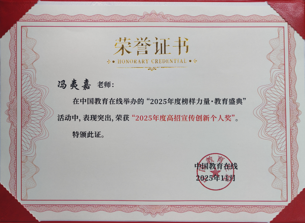 这一殊荣不仅体现了冯夷嘉老师在高招宣传工作中的突出贡献,更反映出学校在招生宣传创新领域的战略布局与显著成果。通过系统总结其成功经验,将有效引导广大教育工作者积极探索创新实践路径,从而为学校招生工作持续注入发展动能。