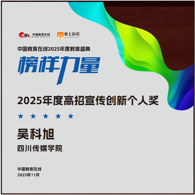 近日,中国教育在线“榜样力量·2025年度教育盛典”优秀案例名单公布。四川传媒学院吴科旭老师凭借在招录工作中的创新能力和独到见解,获评“2025年度高招宣传创新个人”称号。