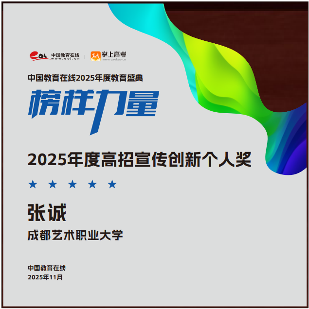 近日,中国教育在线“榜样力量·2025年度教育盛典”优秀案例名单公布。成都艺术职业大学张诚老师凭借在招录工作中的创新能力和独到见解,获评“2025年度高招宣传创新个人”称号。