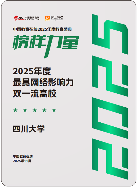 近日,中国教育在线“榜样力量·2025年度教育盛典”优秀案例名单公布。四川大学凭借极具创新性与前瞻性的招生宣传策略,以及扎实过硬的宣传执行实力,从众多高校中突围,获评“2025年度最具网络影响力双一流高校”。