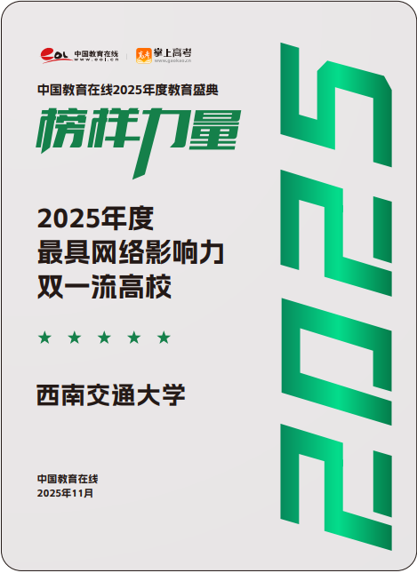 近日,中国教育在线“榜样力量·2025年度教育盛典”优秀案例名单公布。西南交通大学凭借极具创新性与前瞻性的招生宣传策略,以及扎实过硬的宣传执行实力,从众多高校中突围,获评“2025年度最具网络影响力双一流高校”。