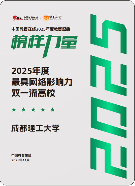 近日,中国教育在线“榜样力量·2025年度教育盛典”优秀案例名单公布。成都理工大学凭借极具创新性与前瞻性的招生宣传策略,以及扎实过硬的宣传执行实力,从众多高校中突围,获评“2025年度最具网络影响力双一流高校”。