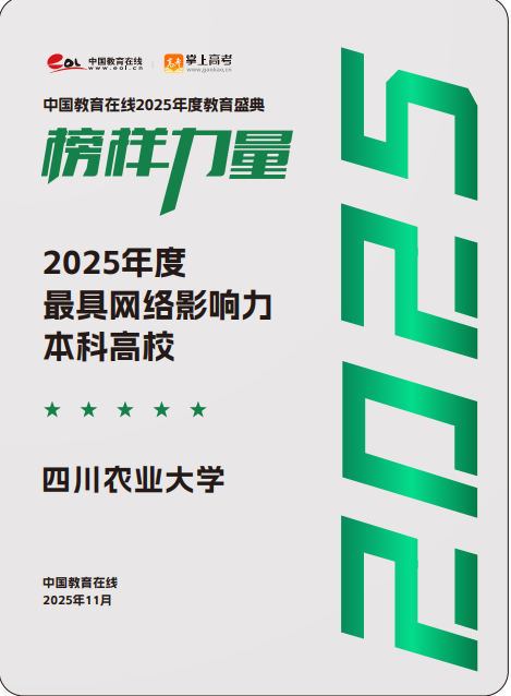近日,中国教育在线“榜样力量·2025年度教育盛典”优秀案例名单公布。四川农业大学凭借极具创新性与前瞻性的招生宣传策略,以及扎实过硬的宣传执行实力,从众多高校中突围,获评“2025年度最具网络影响力本科高校”。