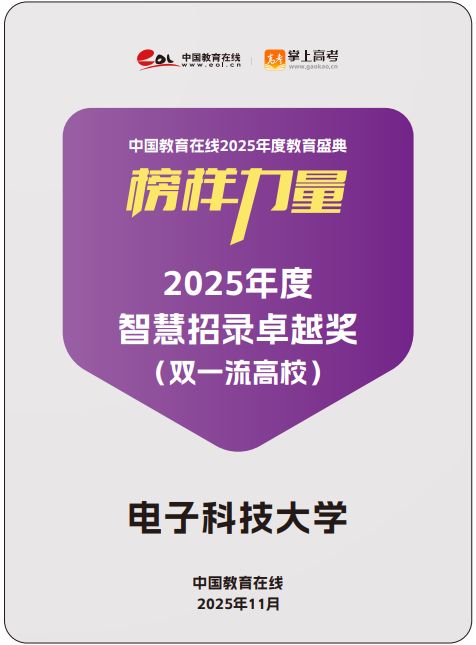 近日,中国教育在线“榜样力量·2025年度教育盛典”优秀案例名单公布。电子科技大学凭借在招录工作中对智慧招录相关技术工具的高水平运用及卓越成果,获评“2025年度智慧招录卓越奖(双一流高校)”。