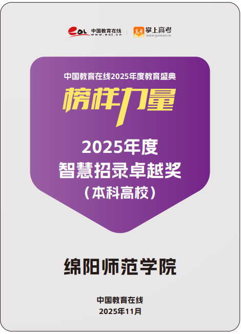 近日,中国教育在线“榜样力量·2025年度教育盛典”优秀案例名单公布。绵阳师范学院凭借在招录工作中对智慧招录相关技术工具的高水平运用及卓越成果,获评“2025年度智慧招录卓越奖(本科高校)”。