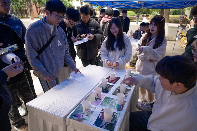 非遗展示区成为活动亮点之一。书法协会搭建互动平台,同学们现场创作禁毒宣言书法作品,在笔墨书香中传递禁毒决心,参与者还可获得定制书签;绵竹年画协会通过展品展示和现场体验,让同学们在感受非遗魅力的同时,将禁毒理念与传统文化传承相结合。游戏互动区同样人气高涨,“禁毒绕口令”“投球识毒”“毒害转盘”等趣味游戏,让同学们在轻松氛围中学习毒品名称、成瘾机制及危害等知识,通过闯关集章兑换禁毒小熊、马克杯等奖品,极大提升了参与积极性。活动尾声,咕噜吉他社成员演唱歌曲《孤勇者》,用激昂旋律传递青春无毒的信念,为活动画上圆满句号。