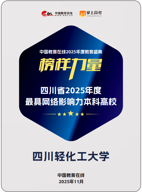 近日,中国教育在线“榜样力量·2025年度教育盛典”优秀案例名单公布。四川轻化工大学凭借极具创新性与前瞻性的招生宣传策略,以及扎实过硬的宣传执行实力,从众多高校中突围,获评“四川省2025年度最具网络影响力本科高校”。
