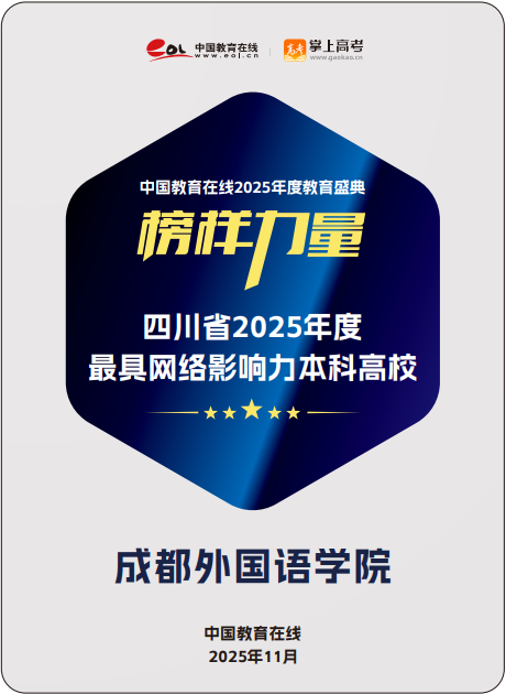 近日,中国教育在线“榜样力量·2025年度教育盛典”优秀案例名单公布。成都外国语学院凭借极具创新性与前瞻性的招生宣传策略,以及扎实过硬的宣传执行实力,从众多高校中突围,获评“四川省2025年度最具网络影响力本科高校”。