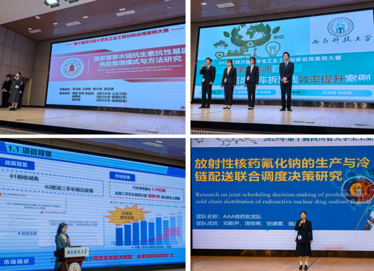 在由教育部工业工程类专业教指委专家及高校、企业、科研院所专家组成的现场评委团的评审下,四川大学的“国家重要水域抗生素抗性基因风险管理模式与方法研究”、西华大学的“放射性核药氟化钠的生产与冷链配送联合调度决策研究”、西南科技大学的“IE驱动的绿色资源循环型报废汽车拆卸线效率提升案例”和西南交通大学的“考虑货架动态布局与物流路径规划的彩电装配调度优化研究”四个案例荣获一等奖。