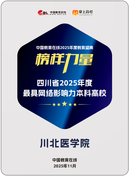 近日,中国教育在线“榜样力量·2025年度教育盛典”优秀案例名单公布。川北医学院凭借极具创新性与前瞻性的招生宣传策略,以及扎实过硬的宣传执行实力,从众多高校中突围,获评“四川省2025年度最具网络影响力本科高校”。
