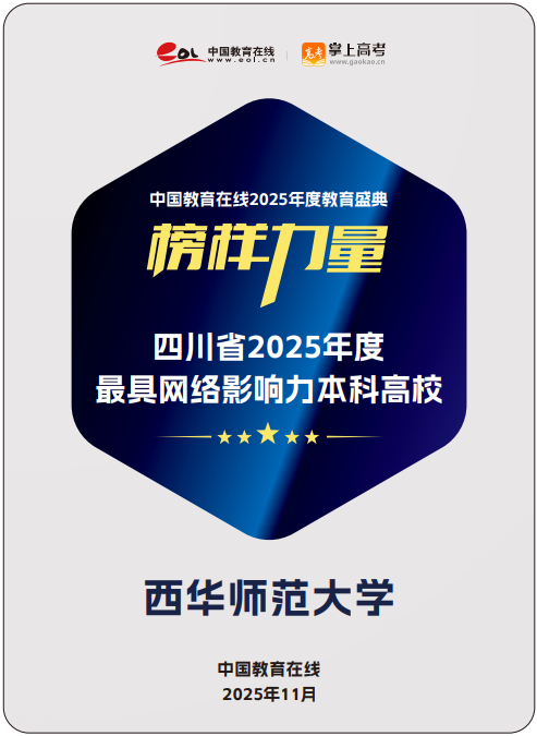 近日,中国教育在线“榜样力量·2025年度教育盛典”优秀案例名单公布,西华师范大学凭借极具创新性与前瞻性的招生宣传策略,以及扎实过硬的宣传执行实力,从众多高校中突围,获评“四川省2025年度最具网络影响力本科高校”。