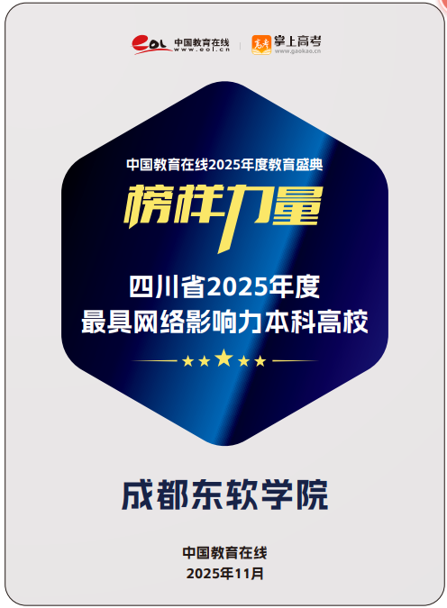 近日,中国教育在线“榜样力量·2025年度教育盛典”优秀案例名单公布,成都东软学院凭借极具创新性与前瞻性的招生宣传策略,以及扎实过硬的宣传执行实力,从众多高校中突围,获评“四川省2025年度最具网络影响力本科高校”。
