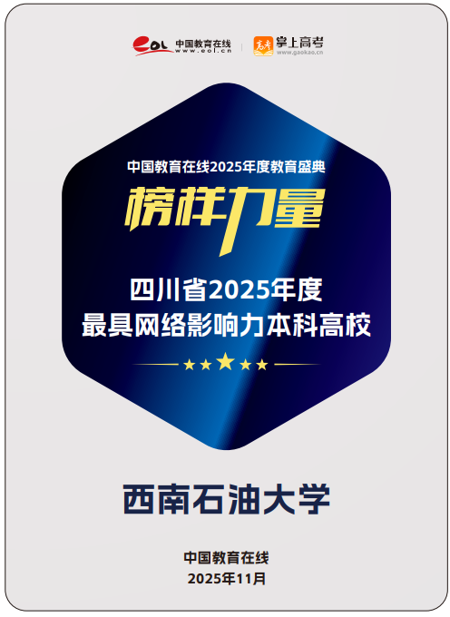 近日,中国教育在线“榜样力量·2025年度教育盛典”优秀案例名单公布,西南石油大学凭借极具创新性与前瞻性的招生宣传策略,以及扎实过硬的宣传执行实力,从众多高校中突围,获评“四川省2025年度最具网络影响力本科高校”。