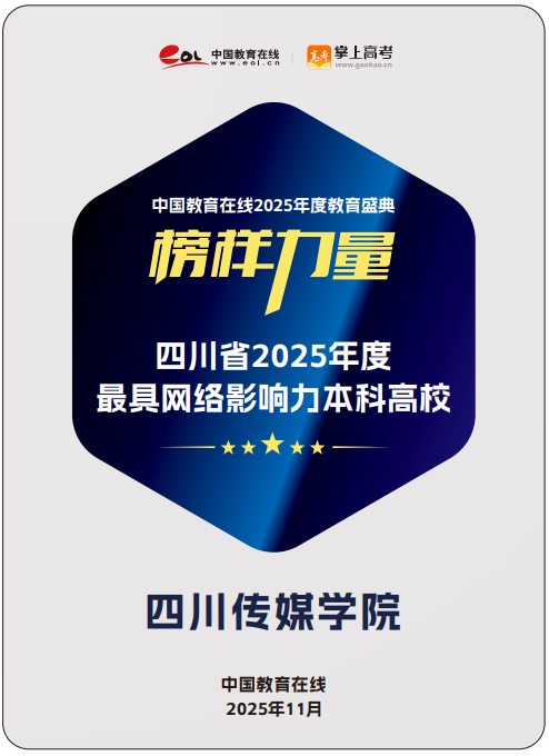 近日,中国教育在线“榜样力量·2025年度教育盛典”优秀案例名单公布,四川传媒学院凭借极具创新性与前瞻性的招生宣传策略,以及扎实过硬的宣传执行实力,从众多高校中突围,获评“四川省2025年度最具网络影响力本科高校”。