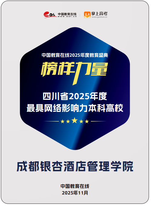 近日,中国教育在线“榜样力量·2025年度教育盛典”优秀案例名单公布,成都银杏酒店管理学院凭借极具创新性与前瞻性的招生宣传策略,以及扎实过硬的宣传执行实力,从众多高校中突围,获评“四川省2025年度最具网络影响力本科高校”。