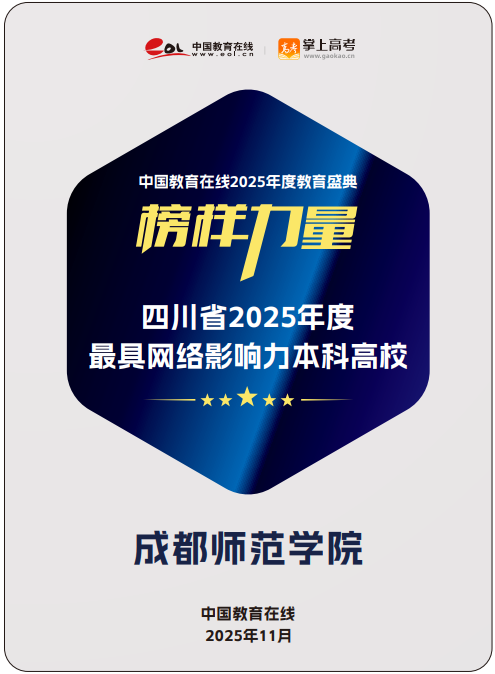 近日,中国教育在线“榜样力量·2025年度教育盛典”优秀案例名单公布,成都师范学院凭借极具创新性与前瞻性的招生宣传策略,以及扎实过硬的宣传执行实力,从众多高校中突围,获评“四川省2025年度最具网络影响力本科高校”。